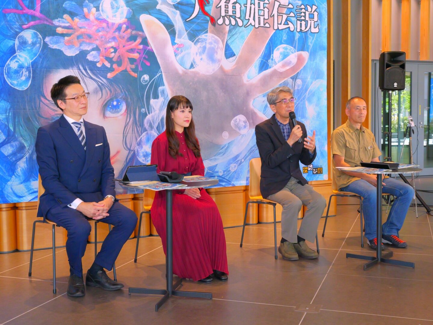 会見ではまず、わらび座の今村晋介代表理事が概要を説明。「多くの人に喜んでいただいた『三湖伝説』に続く『新解釈』ものの第2弾。探検家の髙橋大輔さんと話す中で、秋田に日本最古の人魚の絵が残されている(井川町の遺跡から出土した木簡)ことを知り、作品の着想を得ました。それをファンタジーとしてお届けすることで皆さんに親しんでもらえるのではないかと考えました。家族で楽しめる秋田版『リトル・マーメイド』にしたい」などと話しました。