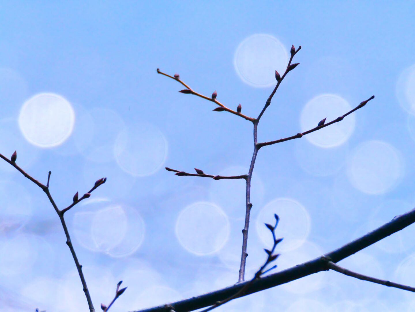 ガラスのすぐ向こうとはいえ今は小さな葉芽。カメラに望遠レンズを取り付けてようやく「これか」という程度です。今年もちゃんと膨らんでいました。赤っぽい殻をかぶったまま成長するようなのですが、すでに若葉色がのぞいているのもありました。桜が満開を迎えるころには若葉色も望遠レンズなしで楽しむことができることでしょう。