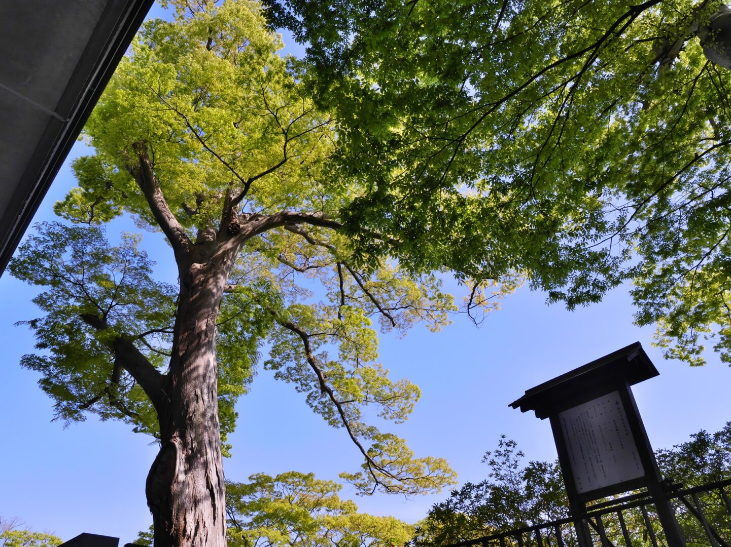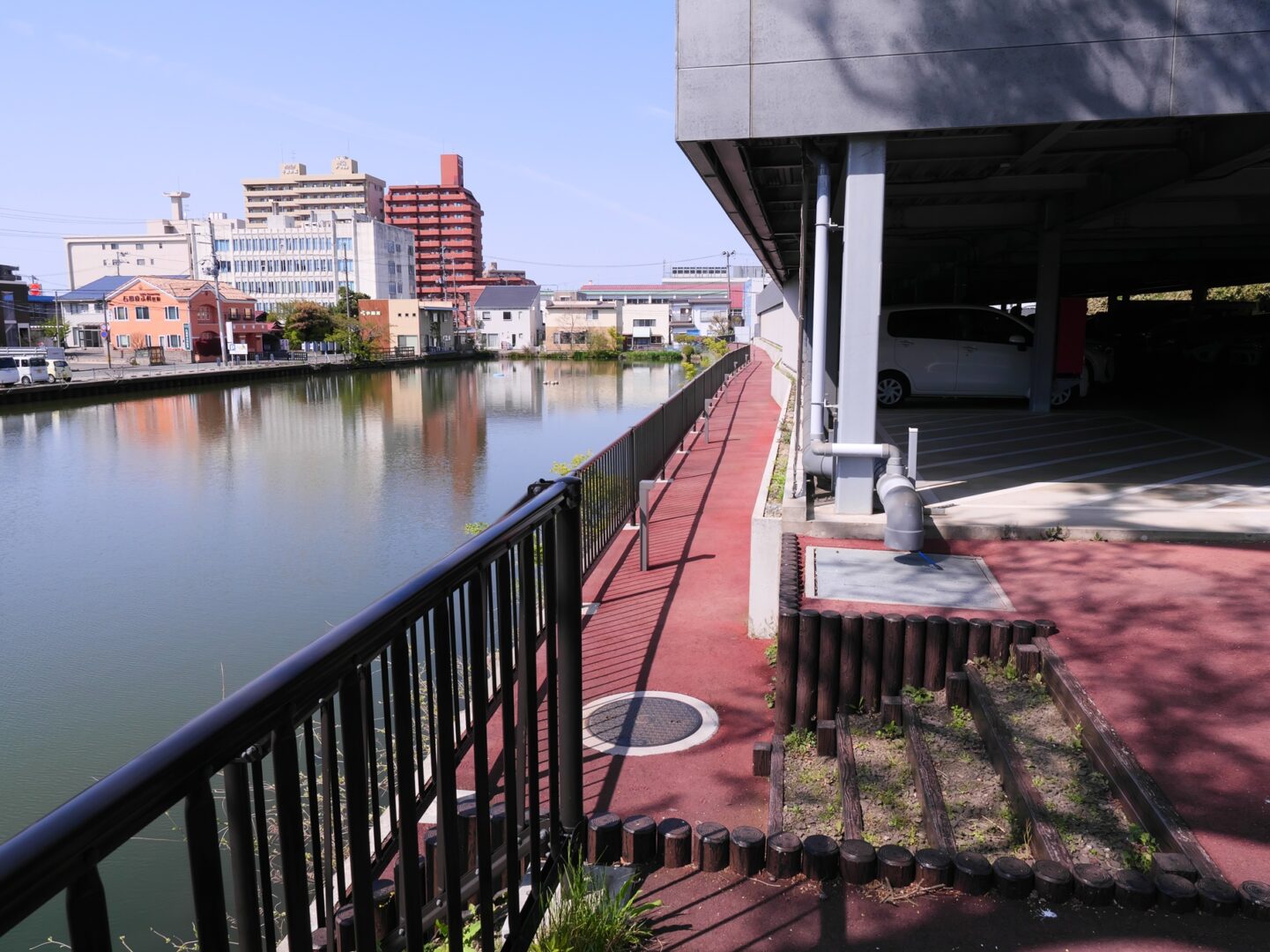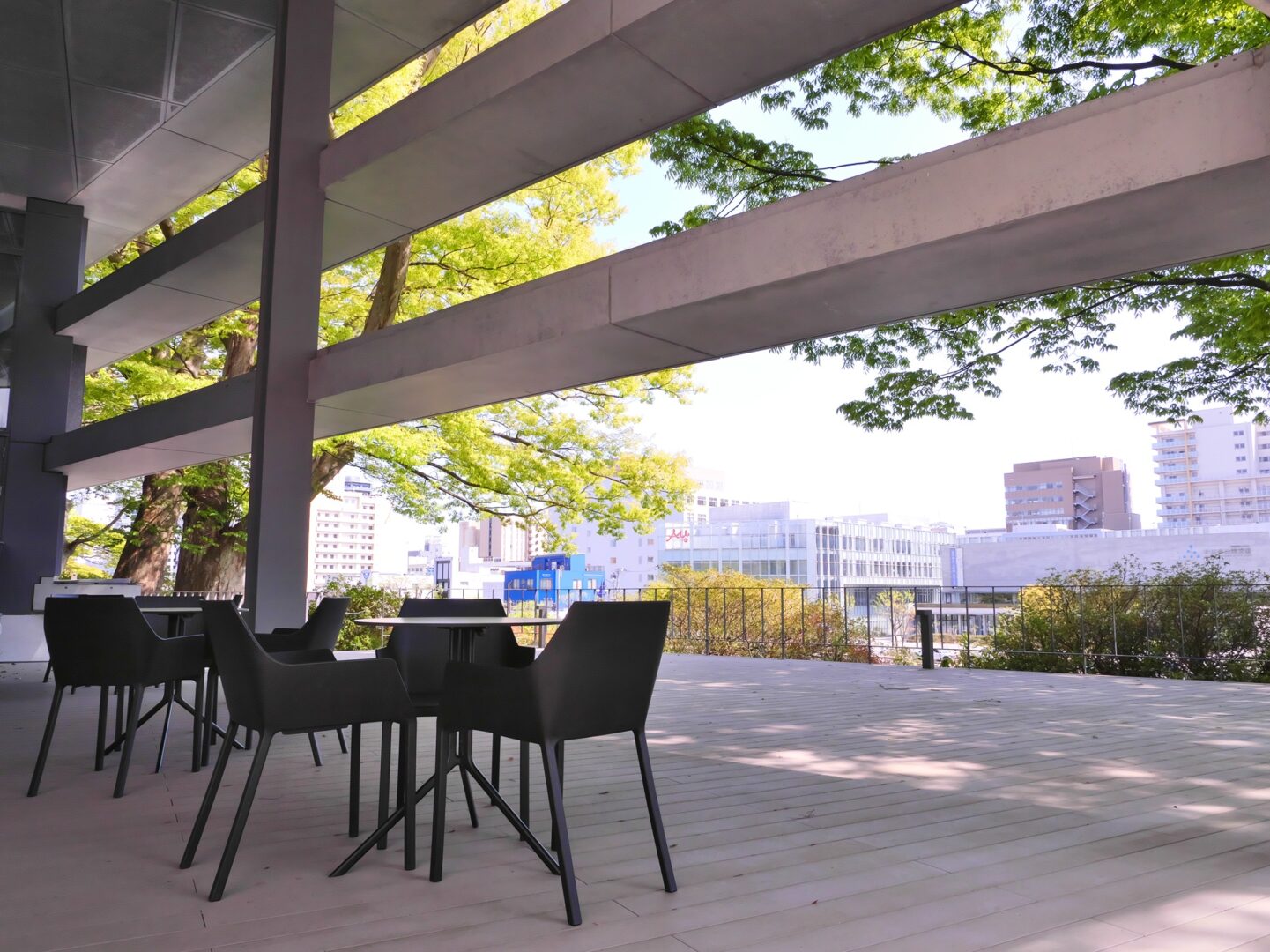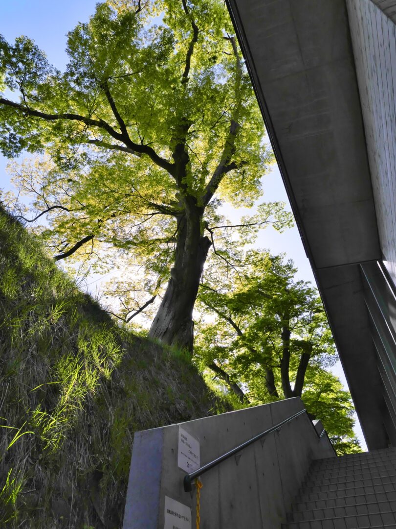 26日(日)はよく晴れて、歩いてみるとケヤキの若葉の透過光を浴びることができました。西側のお堀には鳥の姿が見えました。遊歩道の途中、ミルハス3階ホワイエと同じ高さにある眺望テラスにはどなたでもご利用いただけるテーブルといすが置かれていますので、天気のよい日にはそこでくつろぐのも素敵でしょう。