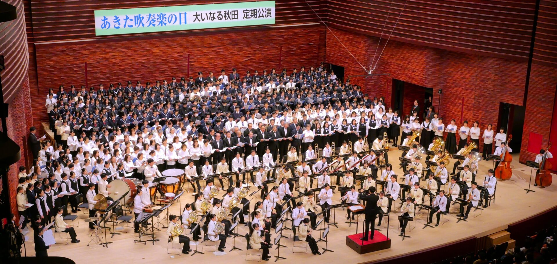 「第3回あきた吹奏楽の日~大いなる秋田 定期公演~」が12月21日、あきた芸術劇場ミルハス大ホールで開かれました。第3部「大いなる秋田」の合唱には秋田県合唱連盟の方々や県民有志、中高生合わせて過去最多の約410人が参加しました。観客数も約1200人と、過去最多となりました。目や耳の不自由な方々のための鑑賞支援サービスでは今回初めて、市民ボランティアにも協力いただき歩行介助や手話対応などを行いました。