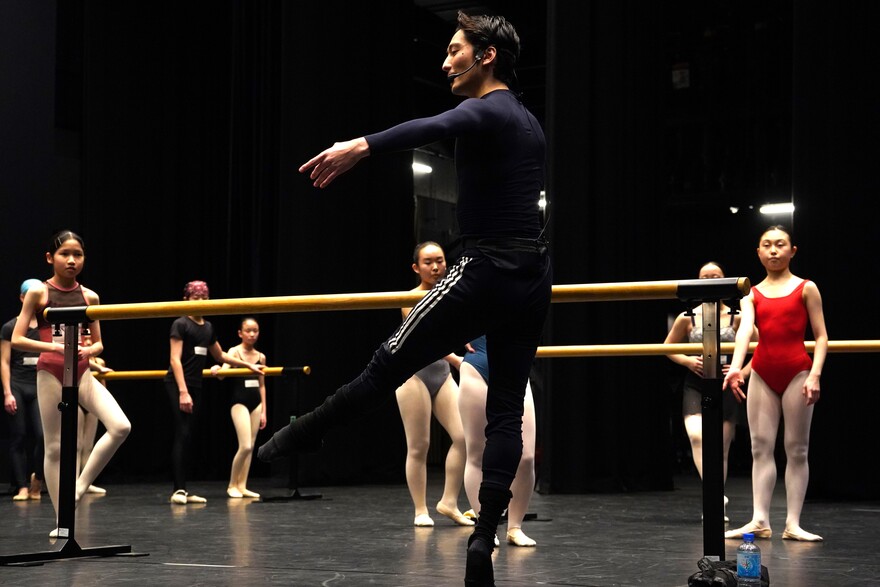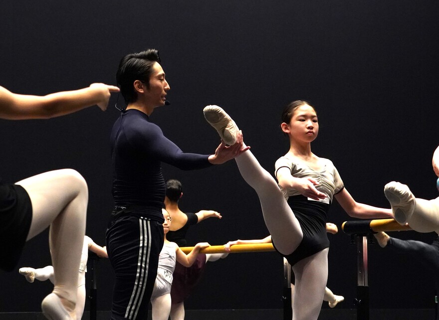 Kバレエ トウキョウのプリンシパル・石橋奨也さん(33)によるバレエワークショップが11日、あきた芸術劇場ミルハス中ホールで開かれました。県内でバレエを習う小学生から高校生の計23人が参加。一流ダンサーの手本を間近で見ながらバレエの基本動作を学びました。