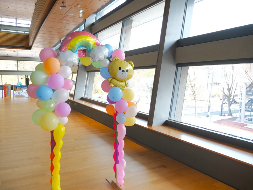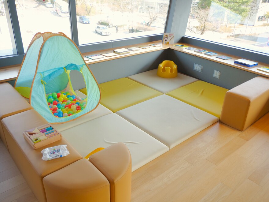 ホールの外には遊具で遊べるキッズスペースや簡易の授乳スペース、ベビーカー置き場を用意。公演中の入退場は自由で、子どもが泣いてしまった時などは防音の多目的室で窓越しに観覧できるようにしました。