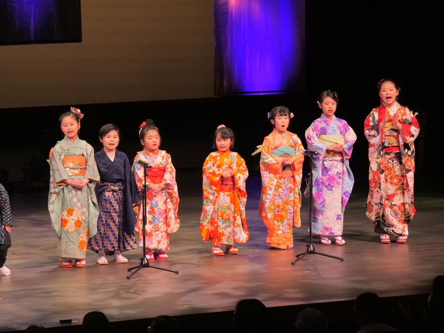続いて、県内で民謡や踊りを習っている園児や小学生らがステージに立ちました。高橋キヌ子ちびっこ社中の9人は「お山こ三里」を踊り、民謡を習い始めて間もない「ちびっこ民謡合唱団」の7人はドンパン節を歌いました。小野さんと浅野さんを交えた全員で秋田節も披露。子どもたちが一生懸命に歌ったり踊ったりする可愛らしい姿に、観客は皆目を細めていました。伴奏の尺八や三味線でも10代の奏者が活躍しました。